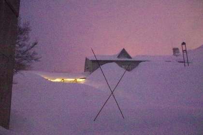 このバッテンの先は、上からつららや雪が落ちてきたり、雪の下に穴や溝、水路があったりして危険な場所を示しています。