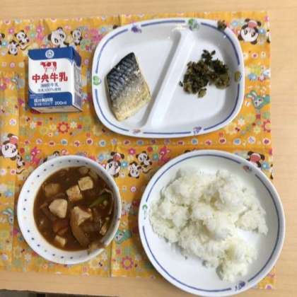 今日の献立は、ごはん、豚汁、七草ごはんの具、さばの塩焼き、牛乳でした。