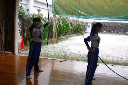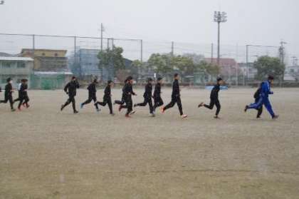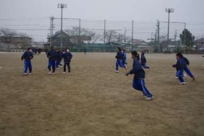 写真は、冬休み最終日、雪が降る寒さの中、部活動に取り組む生徒の様子です。