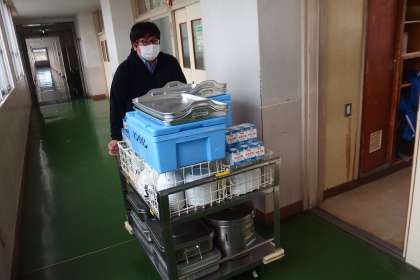 4時間目の終わりが近づくと、授業のない学年の先生が給食のワゴンを運んでくれることが多いです。