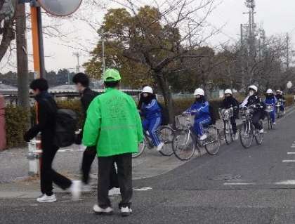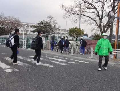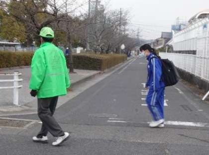 寒さの中でも、地域のボランティアさんは、元気に生徒たちに声をかけてくださいます。