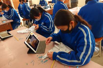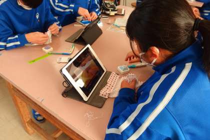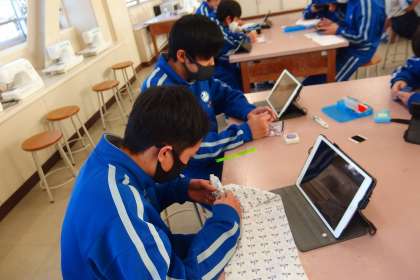 タブレットでお手本の動画を見て参考にしながら、実習を進めています。
