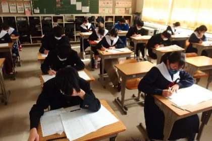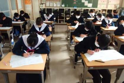 写真は、学年末テストを受ける生徒の様子です。