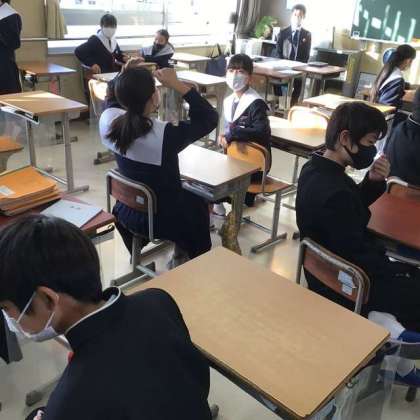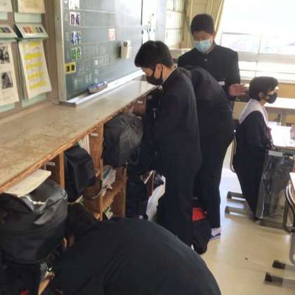 教室後ろのロッカーに駆け寄り、荷物の整理整頓を確認する生徒、近くの生徒と向き合って、頭髪をチェックする生徒など、いろいろな動きを見ることができました。