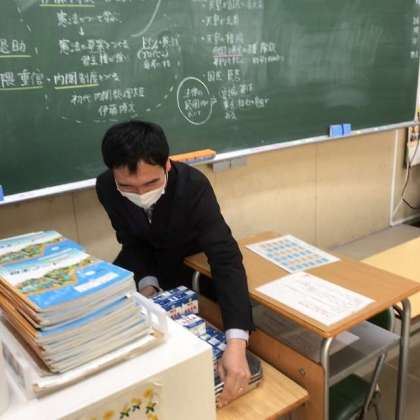 早く教室に戻ってきた生徒が、急いで手伝い始めました。