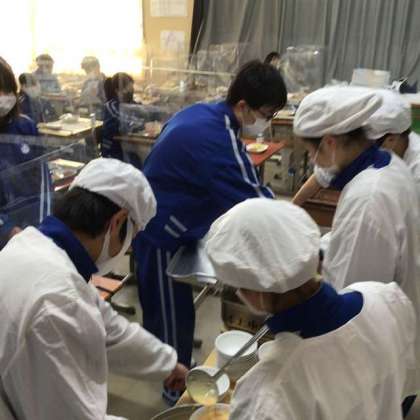 白衣を身につけ、手洗いと手指消毒を終えた給食当番の姿が・・・