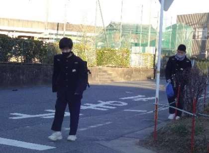 日陰になる正門前の道路を、足早に登校する生徒の姿が目立ちました。