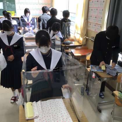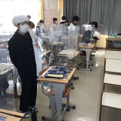 今日は、2年5組の給食準備の様子を見に行きました。
