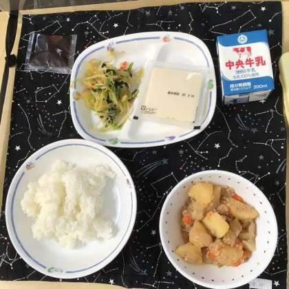 今日の献立は、ごはん、じゃがいものそぼろ煮、おひたし、湯豆腐(みそタレ)、牛乳でした。