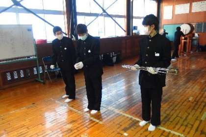 写真は、卒業式に華を添える校旗登壇の新メンバー(2年生)と、早朝から練習に励むメンバーの様子です。