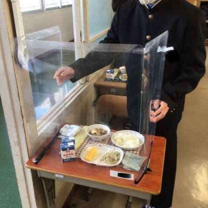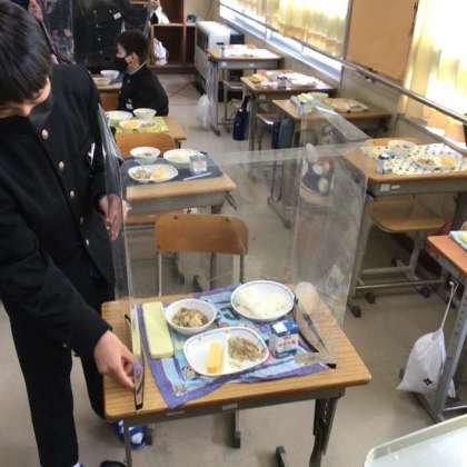 この学級では、配膳が一通り終了したところで、飛沫防止ガードを設置していました。