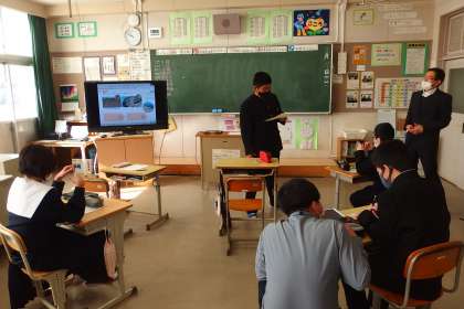 「地層のでき方」を推測して、みんなの前で発表しています。