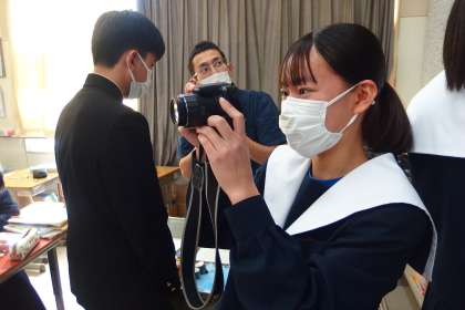 3年生は卒業に向けて様々な企画が進行中なので、担任の先生に写真を撮るように頼まれているであろう女子です。