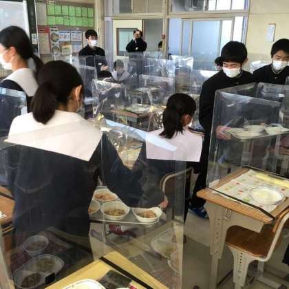 飛沫防止ガードがあっても、速やかに給食が配られていきます。