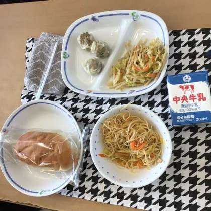 今日の献立は、米粉パン、炒めビーフン、ごぼうサラダ、しゅうまい、牛乳でした。