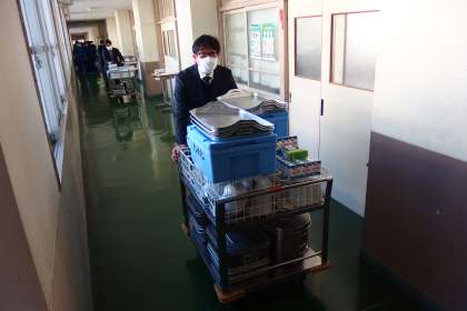 4時間目の終わり際、給食のワゴンを配膳室から教室の前まで運んでいる3年生の先生方です。
