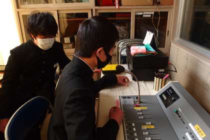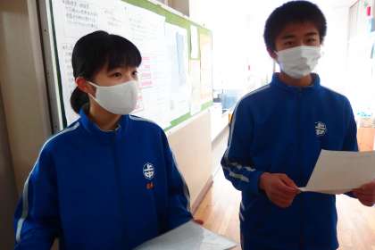 お昼の放送を担当してくれた放送委員と給食献立一口メモを紹介してくれた給食委員です。