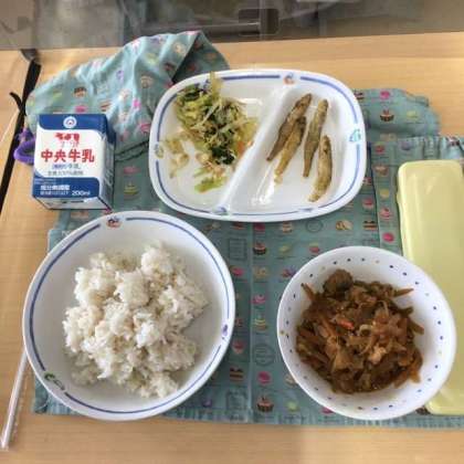 今日の献立は、麦ごはん、豚みそ丼の具、ごまあえ、わかさぎのから揚げ、牛乳でした。