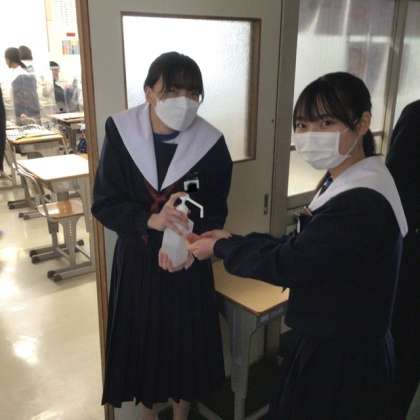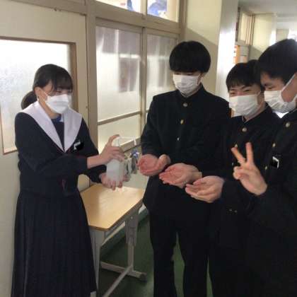 消毒係の女子に、男子生徒が群がります。