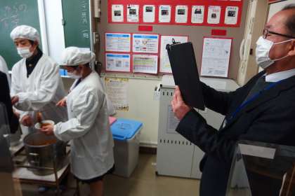真ん中の写真は、給食の配膳の様子を撮影する校長先生です。