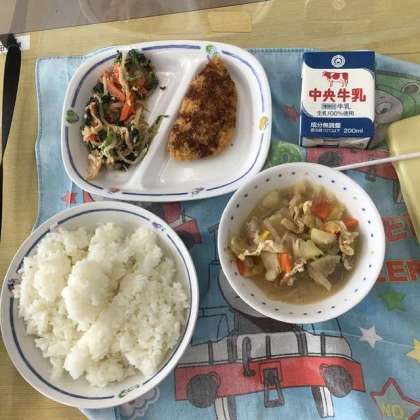 今日の献立は、ごはん、根菜のごま汁、ほうれんそうのあえもの、あじフライ、のり佃煮、牛乳でした。