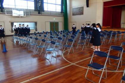 卒業式練習のために、朝早くからいすを並べてくれている3年生のボランティアの方々です。