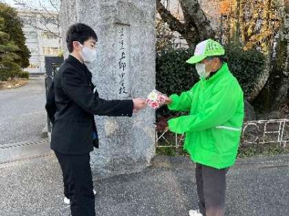 毎週月曜日と木曜日の登校時に、正門や西門に立って、生徒たちに元気な声をかけてくださるボランティアさんに、卒業生から花が贈られました。