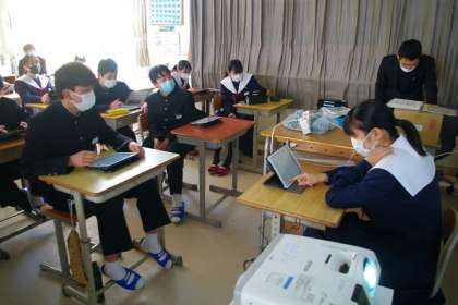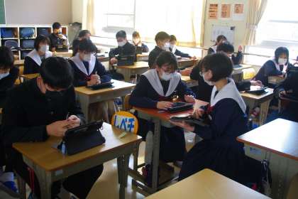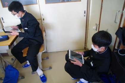 卒業を前に、3年生がタブレットパソコンの初期化や設定の復元を行っています。