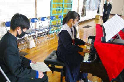 3枚目の写真は、証書授与時のBGMと校歌の伴奏を演奏してくれる在校生代表の生徒です。