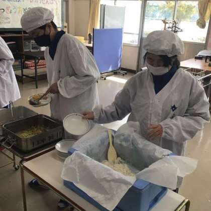 今日は、1・2学級の給食準備の様子を見に行きました。