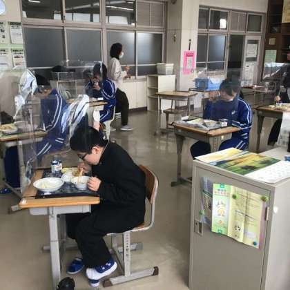 卒業式の花を見ながら、美味しく食べました 【今日の給食 1・2学級】