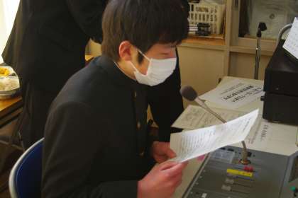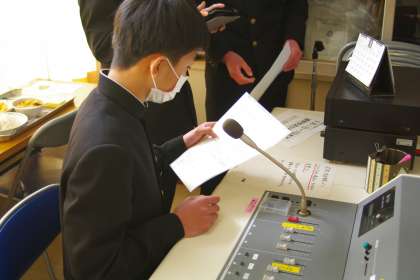 お昼の放送を担当してくれた放送委員と給食献立一口メモを紹介してくれた給食委員です。