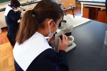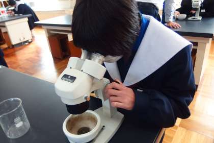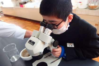 特別支援学級の理科の授業で火山灰を顕微鏡で観察しています。