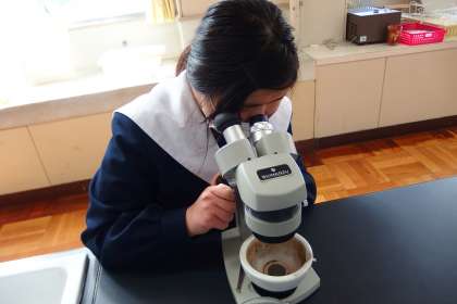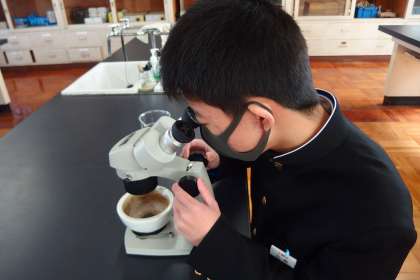 特別支援学級の理科の授業で火山灰を顕微鏡で観察しています。