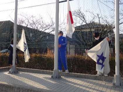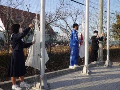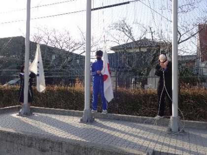写真は、今の後期生徒会役員の生徒が中心となって、国旗・市旗・校旗を掲揚しているところです。