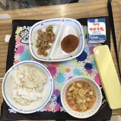今日の献立は、麦ごはん、ミネストローネ、きんぴらピラフの具、ミンチカツ、牛乳でした。
