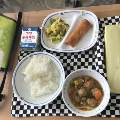 今日の献立は、肉だんごとはくさいの中華炒め、華風あえ、春巻き、牛乳でした。