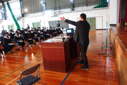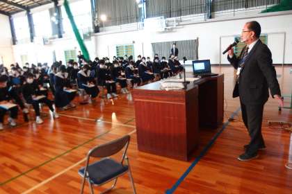 校長授業という形で講話が進んでいきましたが、「職業人から学ぶ会」となっているとおり、今年度末で教職生活を退職される校長先生が、38年間の「教職という仕事」を振り返り、1年生に職業観と人生観を語りかけました。
