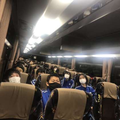 バス車内では、生徒たちは静かにDVDを鑑賞しています。