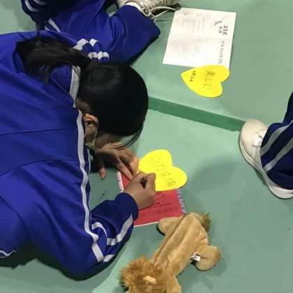 夜に行われた立志式第2部では、「私の大切にしたい言葉(パワーフレーズ)」をハート型のフェルトに記入しました。