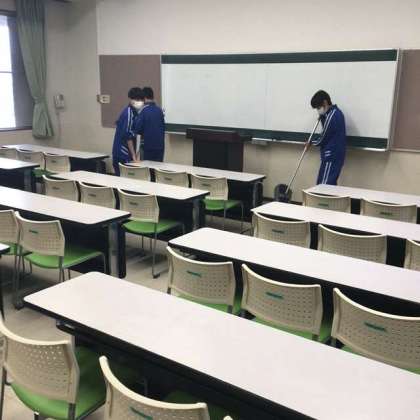 写真は、家族への手紙で使用した学習室を掃除する男子生徒の様子です。