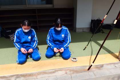上は弓道部で、弦の張り直しをしていました。