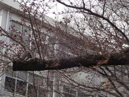 正門の上中桜は、朝の段階では、まだ一輪も花が開いていませんでした。