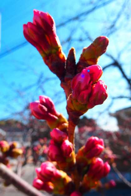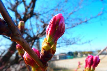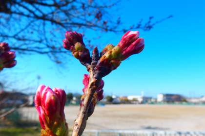 グランド東側、トレーニングヒルの桜の花のつぼみが、ずいぶんと色づいてきました。