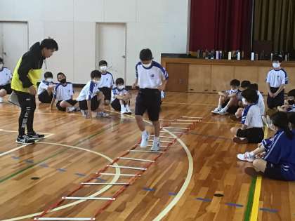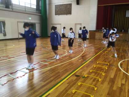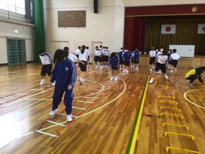 ラダーやミニハードルを使って、いろいろな動きに挑戦しました。