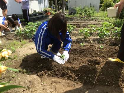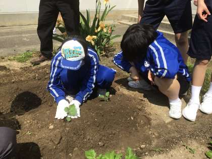 1、2学級の子たちが、畑に野菜の苗を植えていました。
