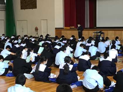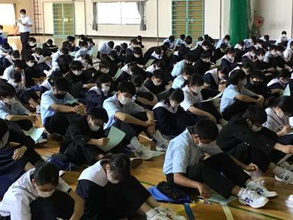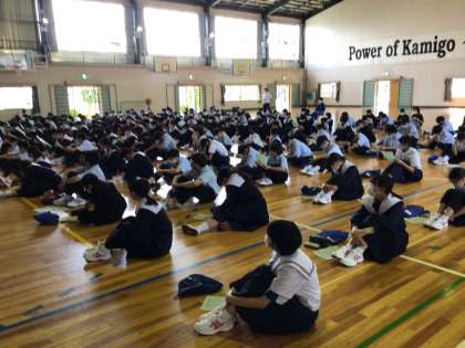 本日5時間目は、1年生が体育館に集まって来週行われる地域学習についての学年集会を行っています。地域学習会の概要や持ち物、歩くコース等について説明を聞きました。皆さん真剣な表情で話を聞いています。二日間行われる地域学習では、楽しいイベントもたくさんあります。後は心配なのは天気です。今のところ曇りの予報のようですが、1年生の皆さんの元気の良さで、必ず良い天気になると信じています。25日水曜日は、弁当が必要になります。お家の方は弁当持参にご協力ください。