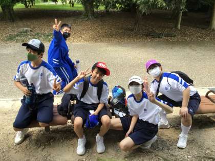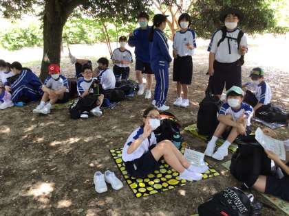 柳川瀬公園に到着しました。ミッションを解きながら休憩しています。ここまで一人の体調不良者も出ることなく、順調に歩みを進めてきました。広々とした公園でしばし休憩して、この後の行程も元気よく歩いてください。予定よりも15分ほど早く進んでいます。せっかくの校外学習です。あんまり急がずにゆっくりと楽しんできてください。