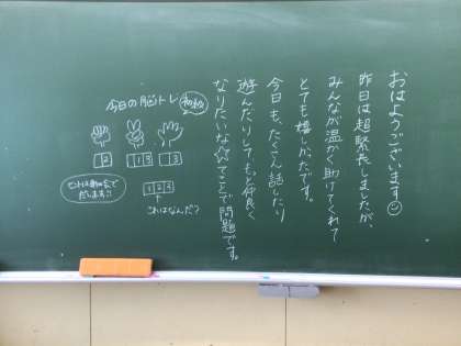 3組の黒板には、教育実習の先生からのメッセージがありました。
