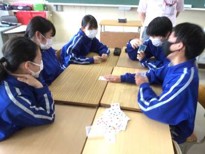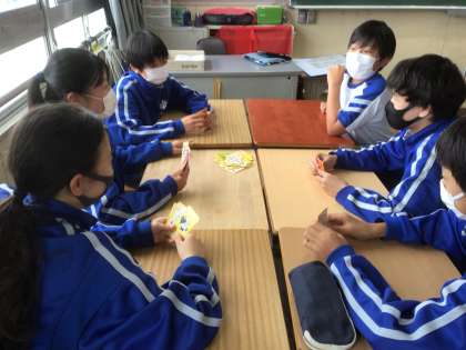 学級の時間にグループでカードゲームをして楽しんでいました。